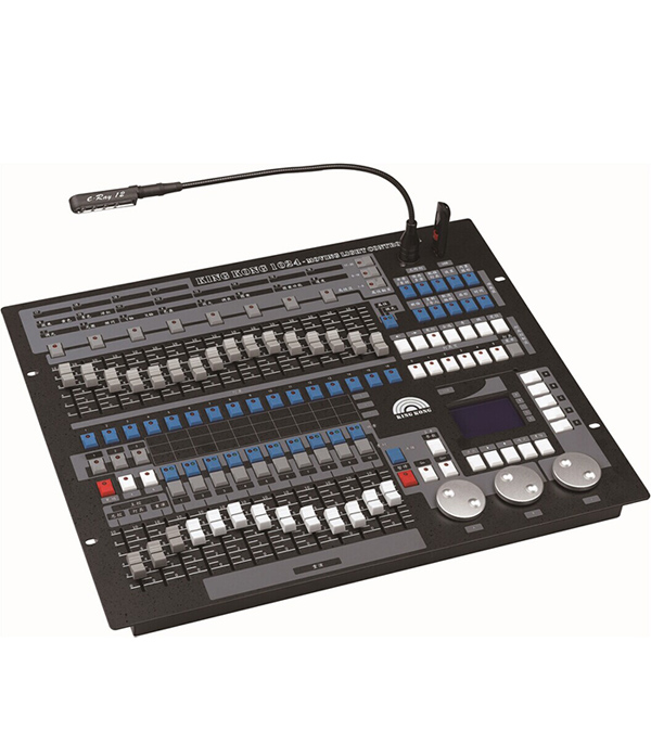 1024系列電腦燈光控制臺(tái)可同時(shí)控制96臺(tái)電腦燈。讀取珍珠R20格式燈庫,內(nèi)置圖形效果,輕松實(shí)現(xiàn)X/Y走圓,RGB彩虹效果,走馬燈等效果。能同時(shí)運(yùn)行10個(gè)場(chǎng)景、10個(gè)內(nèi)置圖形,可使用推桿運(yùn)行場(chǎng)景并對(duì)場(chǎng)景光亮輸出進(jìn)行調(diào)整。★ DMX512/1990標(biāo)準(zhǔn),最大1024個(gè)DMX控制通道,光電隔離信號(hào)輸出。★ 最大控制96臺(tái)電腦燈或96路調(diào)光,每臺(tái)電腦燈最多可用控制40主通道+40微調(diào)通道,使用珍珠R20燈庫。★內(nèi)置圖形軌跡發(fā)生器,有135個(gè)內(nèi)置圖形,方便用戶對(duì)電腦燈進(jìn)行圖形軌跡控制,如畫圓、螺旋、彩虹、追逐等多種效果。圖形參數(shù)(如:振幅、速度、間隔、波浪、方向)均可獨(dú)立設(shè)置。★60個(gè)重演場(chǎng)景,可同時(shí)運(yùn)行的場(chǎng)景數(shù)量10個(gè),用于儲(chǔ)存多步場(chǎng)景和單步場(chǎng)景。多步場(chǎng)景最多可儲(chǔ)存600步,每個(gè)場(chǎng)景可存儲(chǔ)圖形數(shù)量 5個(gè),帶背光的LCD顯示屏,中英文顯示★關(guān)機(jī)數(shù)據(jù)保持。U盤備份和升級(jí)。專業(yè)鵝頸工作燈,適合室內(nèi)外演出使用。(選配)電源:AC 100- 240V / 50-60Hz。尺寸:485mm X 420mm X 105mm(L×W×H)。