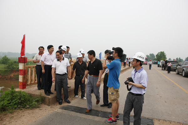 孫曉山廳長一行深入查看了樟山庫區防護工程的施工現場,并認真聽取了我公司項目經理彭紅軍對工程整體布置、進度及工程施工中遇到的困難和問題等的簡要匯報。樟山防護工程施工戰線長、作業難度大、牽涉的范圍點多面廣,是峽江水利樞紐庫區防護工程施工難度最大的項目之一,孫廳長對工程進展情況非常關心。聽取匯報后,孫廳長指出:一是要做好民生工程,做好移民、征地、拆遷等工作,為工程施工提供便利;二是要爭取早日施工,在早稻收割完成后立即進行工程施工,確保工程于明年7月份完成主體工程;三要合理安排施工工期,確保峽江水利樞紐蓄水及第一臺發電機組按期發電。