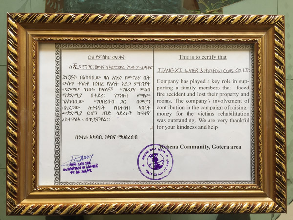 近期,在我辦事處所在地社區(qū)居民Alemayehu Bekele家不幸遭遇無情火災(zāi)、家庭陷入極度困境的時(shí)刻,江西水建駐埃分公司向其伸出援手,助其迅速重建家園。事后,Gotera社區(qū)協(xié)調(diào)員及警察所官員一行為我公司這種義舉表示贊賞并頒發(fā)了感謝證證書。