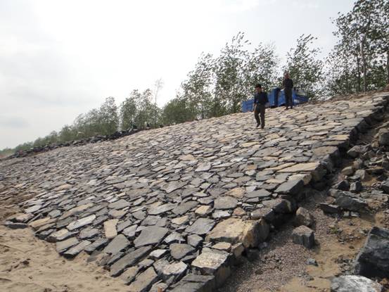 [注:九江長江江心洲固岸應急度汛工程,包括九江縣江新洲1標和彭澤縣棉船洲1標,由我公司中標承建。工程主要建設內容為拋石、砼四邊六面框架、干砌石護坡,項目總投資4000萬元。江新洲和棉船洲大堤共保護面積130.39 平方公里,保護耕地12.18萬畝,保護人口8.39萬人,圩區內土地肥沃,灌溉便利,是江西省的重要棉油生產基地。]