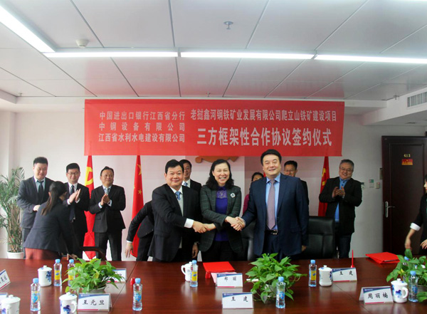 12月29日上午,在江西省商務廳副廳長方向軍、外經處處長王健的見證下,公司與中國進出口銀行江西省分行和中鋼設備有限公司就老撾鑫河鋼鐵礦業發展有限公司爬立山鐵礦建設項目正式簽訂三方框架性合作協議。中國進出口銀行江西省分行行長鄭麗、中鋼設備有限公司總經理王建、公司董事長王元旦、海外公司總經理黃鄭民等出席簽約儀式。
