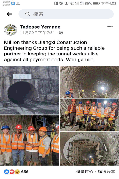 參觀結(jié)束時(shí),Tadesse先生由衷感謝大家的辛勤付出,對(duì)項(xiàng)目部順利完成隧洞首倉(cāng)襯砌砼表示高度贊許,并相信項(xiàng)目部一定能保質(zhì)保量完成隧洞二期襯砌施工。Tadesse先生還在Facebook(臉書(shū))平臺(tái)分享了本次隧洞參觀的經(jīng)歷,并表達(dá)了對(duì)我公司作為戰(zhàn)略合作伙伴的充分信任。