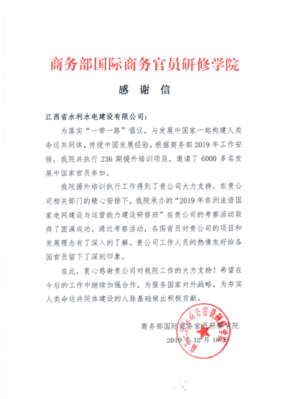 人力資源2019年,公司圍繞國家和我省“走出去”戰(zhàn)略,積極配合商務(wù)部及省內(nèi)援外培訓(xùn)工作,得到各方認可。近日,公司收到來自商務(wù)部國際商務(wù)官員研修學(xué)院的感謝信,信中提到,商務(wù)部研修學(xué)院援外培訓(xùn)工作得到我公司的大力支持,“2019年非洲法語國家電網(wǎng)建設(shè)與運營能力建設(shè)研修班”考察、交流活動取得圓滿成功,對公司的積極配合表示衷心感謝。